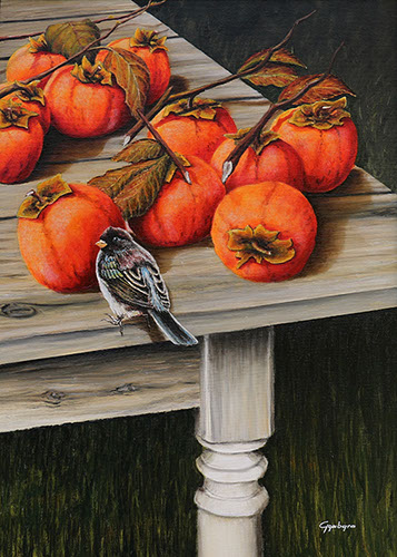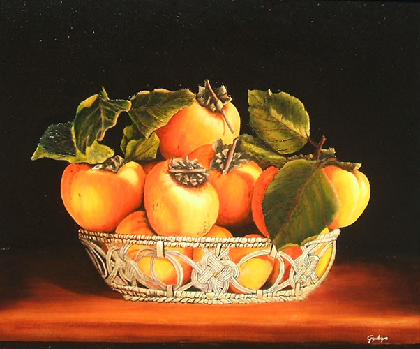 Cestino con cachi / Olio su supporto telato, 60x50, 2016
